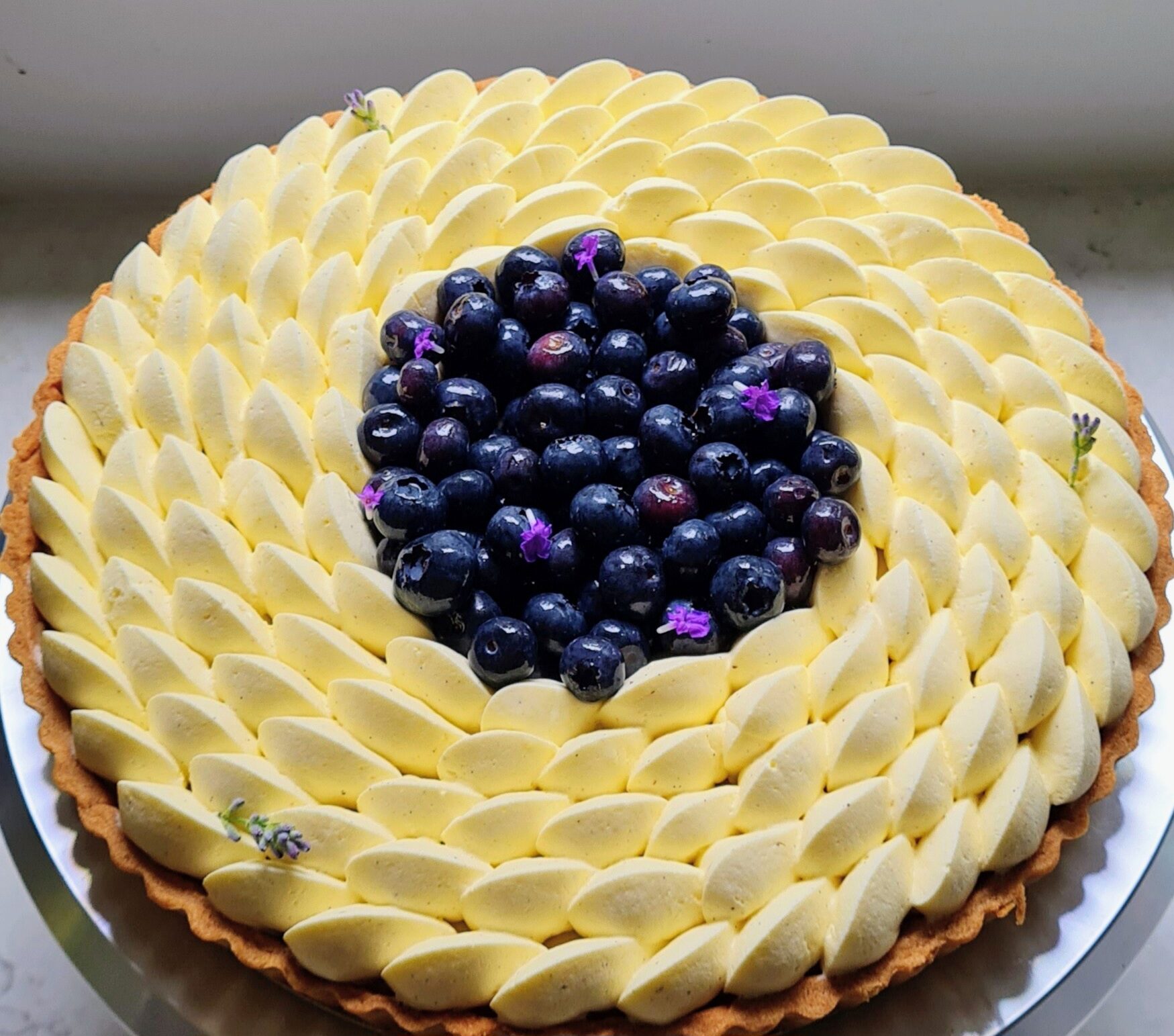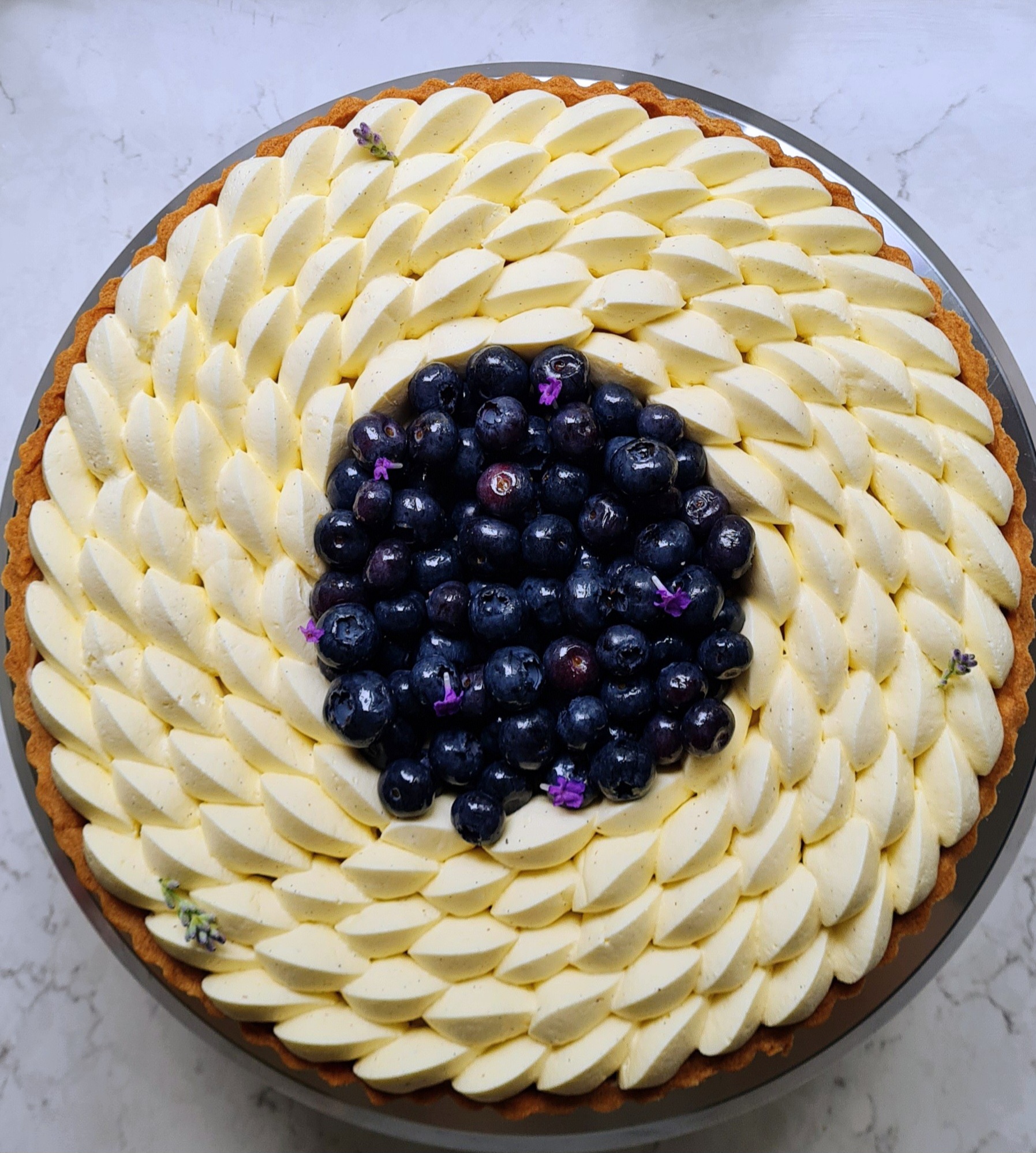 Buttery crisp sable tart lined with blueberry compote, earl grey and lavender infused Crème Pâtissière and topped with marscapone chantilly cream and fresh blueberries.